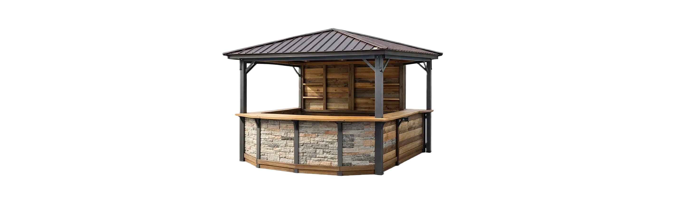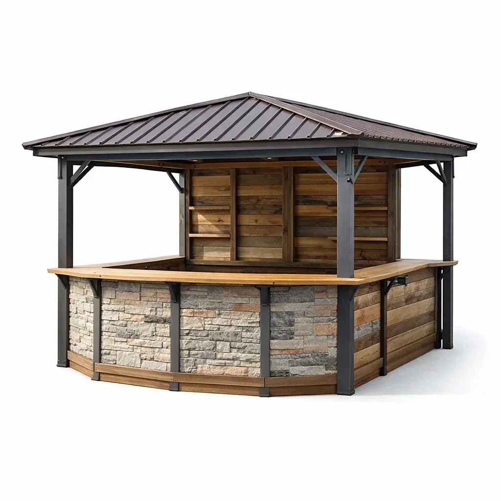 Gazebo da esterno in legno e metallo con tetto in lamiera nera