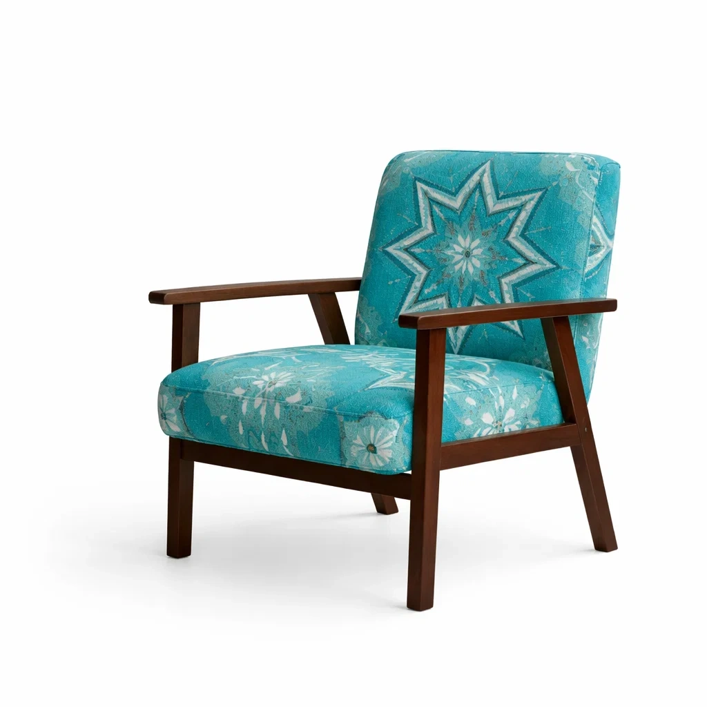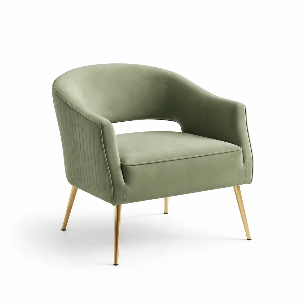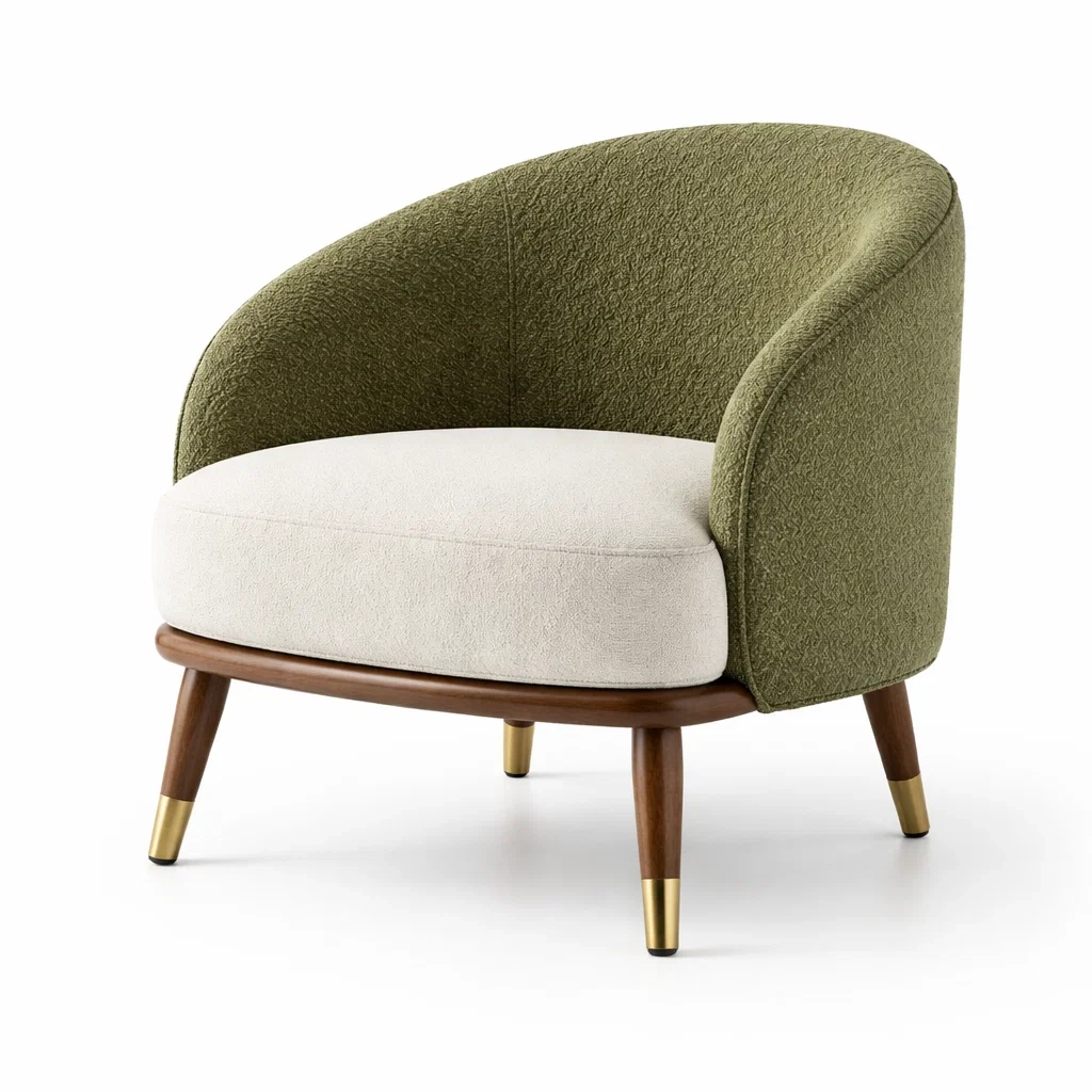 Poltrona in tessuto verde e beige con struttura in legno e gambe in metallo